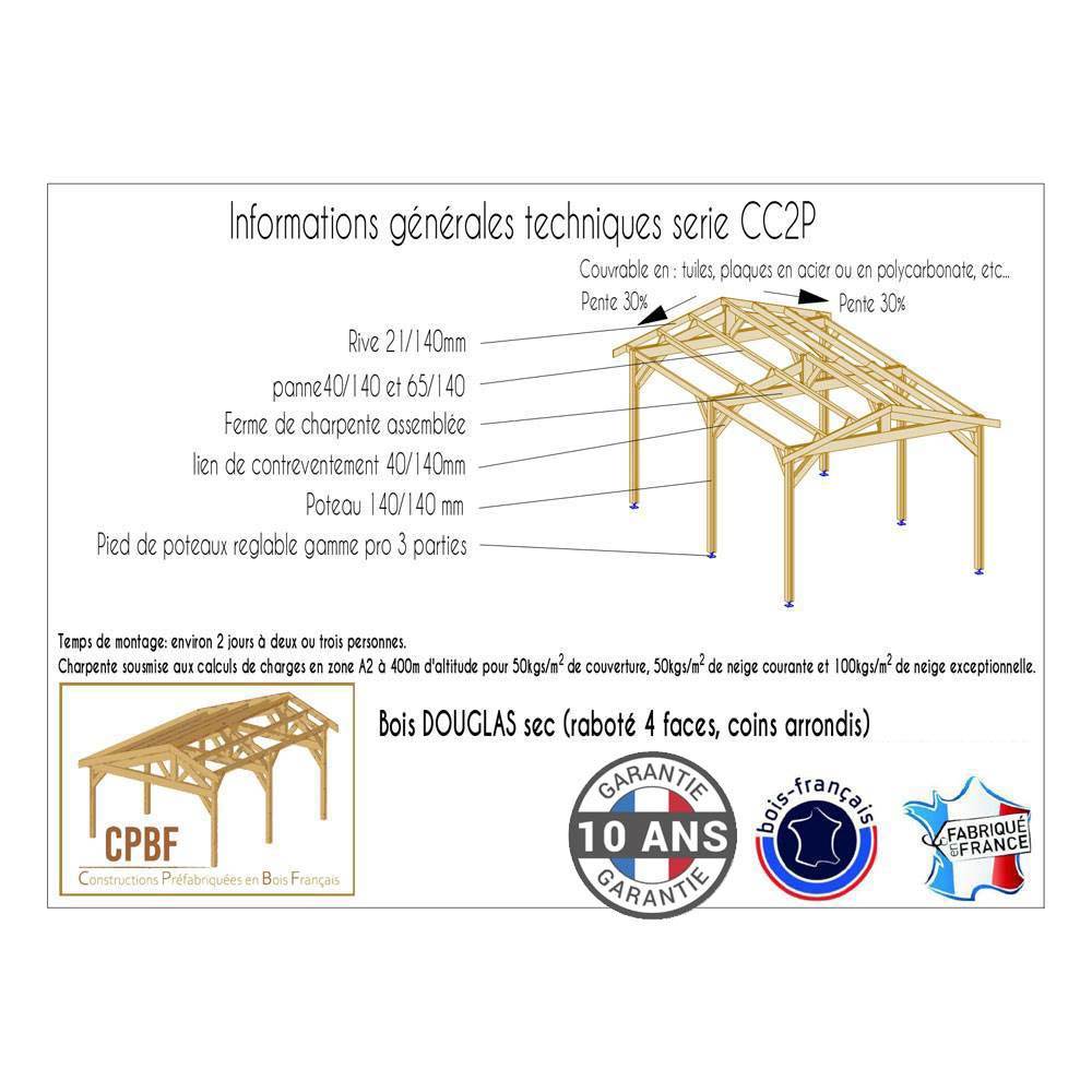 Mono-pente ou 2 pentes = 30%. Kit comprenant fermes de charpente, pannes, planches de rive, liens de contreventement, poteaux 14-14cm +/- 5mm en 3 parties, quincaillerie d'assemblage comprise.