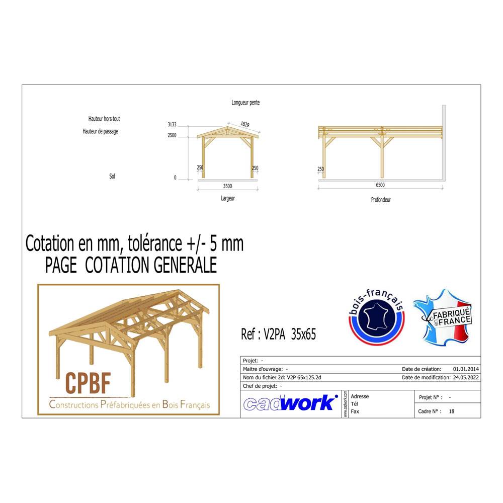 1. Abri Deux Pentes Adossé, Bois DOUGLAS Français, Carport, Auvent, Abri voiture, 350cmx650cm, CPBF