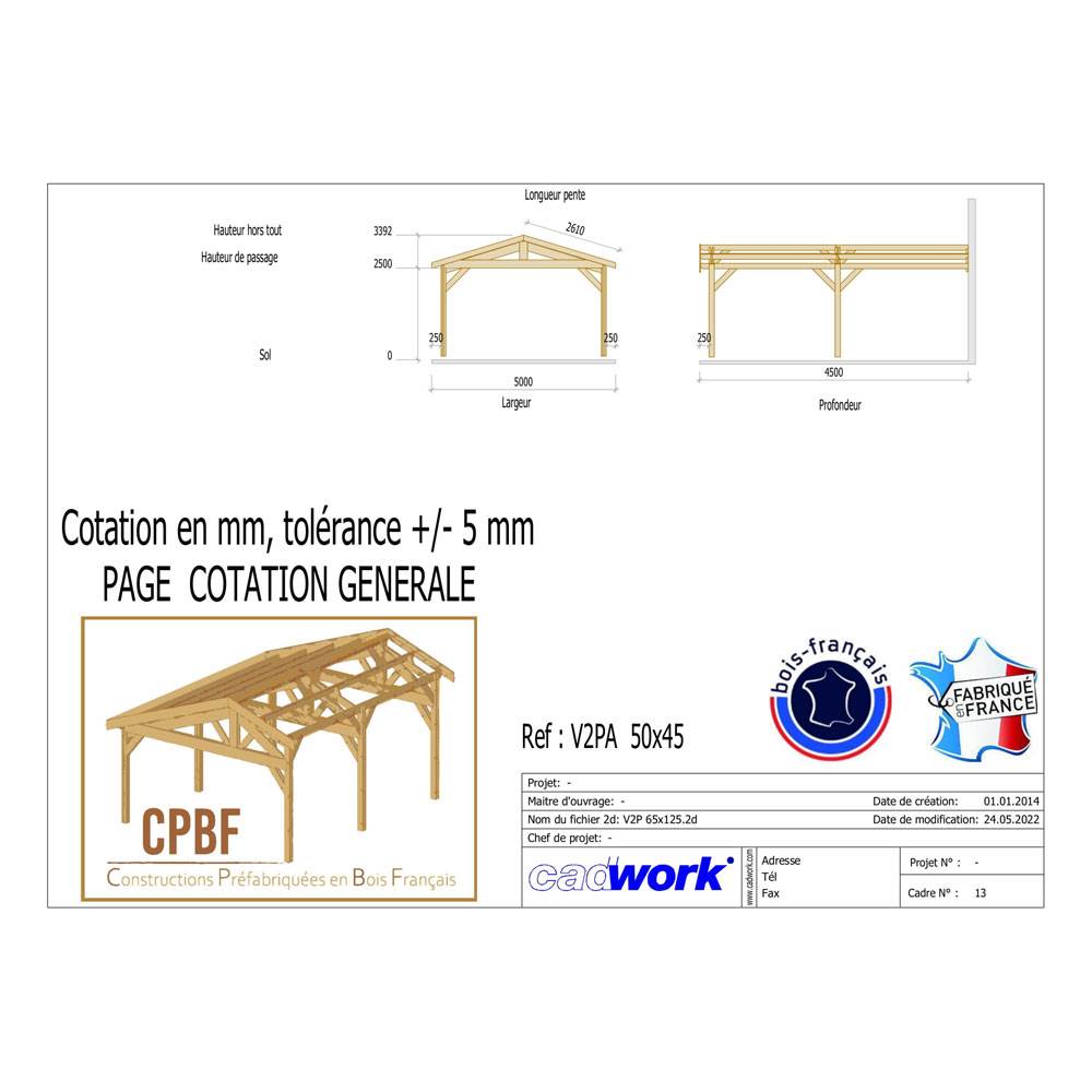 1. Abri Deux Pentes Adossé, Bois DOUGLAS Français, Carport, Auvent, Abri voiture, 500cmx450cm, CPBF