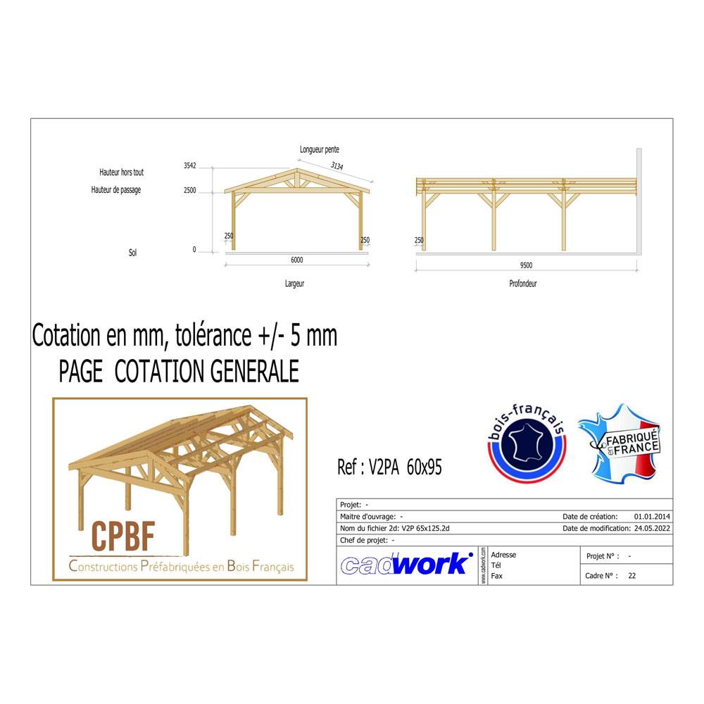 1. Abri Deux Pentes Adossé, Bois DOUGLAS Français, Carport, Auvent, Abri voiture, 600cmx950cm, CPBF