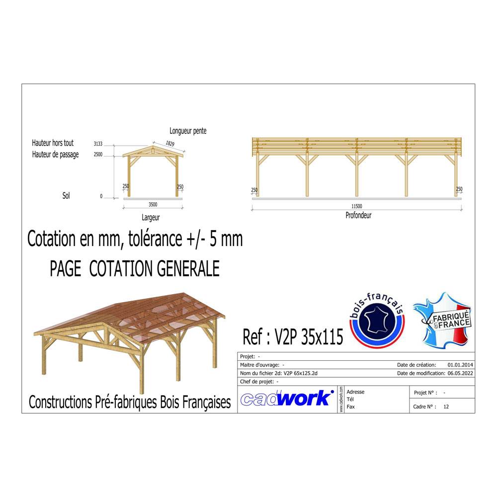 1. Abri Deux Pentes, Bois DOUGLAS Français, Carport, Auvent, Abri voiture, 350cmx1150cm, CPBF