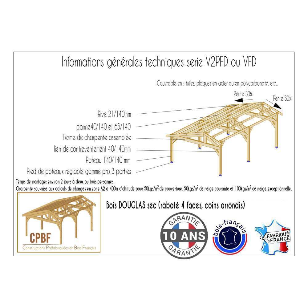 Mono-pente ou 2 pentes = 30%. Kit comprenant fermes de charpente, pannes, planches de rive, liens de contreventement, poteaux 14-14cm +/- 5mm en 3 parties, quincaillerie d'assemblage comprise.