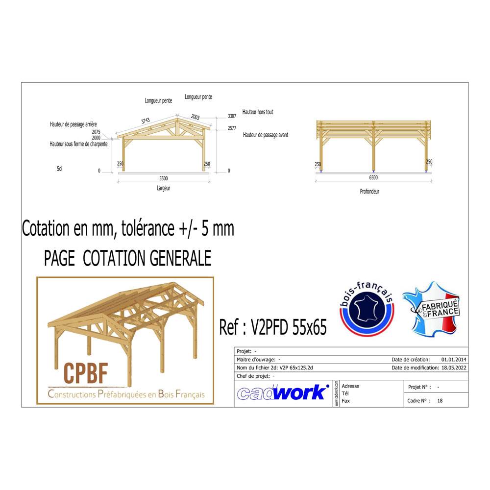 1. Abri Deux Pentes Faitage Décalé, Bois DOUGLAS Français, Carport, Auvent, Abri voiture, 550cmx650cm, CPBF