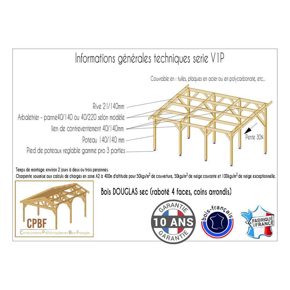 Mono-pente ou 2 pentes = 30%. Kit comprenant fermes de charpente, pannes, planches de rive, liens de contreventement, poteaux 14-14cm +/- 5mm en 3 parties, quincaillerie d'assemblage comprise.