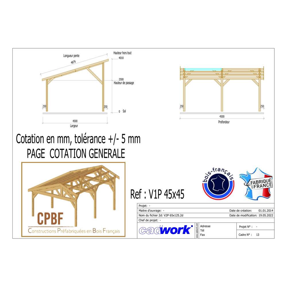 1. Abri Une Pente, Bois DOUGLAS Français, Carport, Auvent, Abri voiture, 450cmx450cm, CPBF