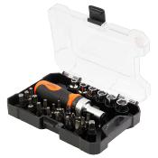 Coffret composé d'un tournevis à cliquet réversible,un connecteur hexagonal 1/4,6 douilles 5 - 6 - 7 -8 - 9 - 10 mm,20 embouts (6 Tamper torx : 10- 15- 20- 25 - 30 - 40 mm / 3 fentes : 4 -5 -6 mm / 4 hexagonaux 3 -4 - 5 -6 mm / 3 Phillips: 1- 2- 3 mm / 3 Pozidriv 1 - 2 - 3 )