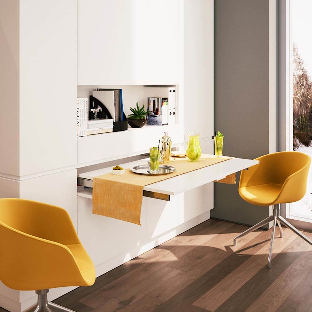Le système Lunch+39 se compose de guides permettant d'extraire une table pilante cachée dans un compartiment pouvant accueillir un tiroir. L'utilisation de ce système est prévue pour le salon ou un espace de travail à la maison car la profondeur de l'installation est de 390 mm.