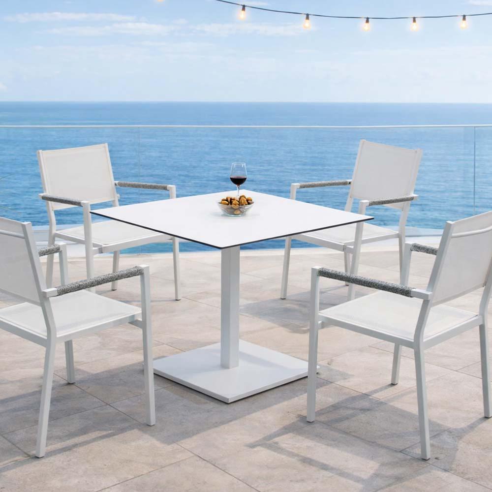 - Table BRISOL avec plateau HPL blanc haute résistance, dimensions 80 x 80 x 75 cm, facile à entretenir et conçue pour un usage extérieur intensif