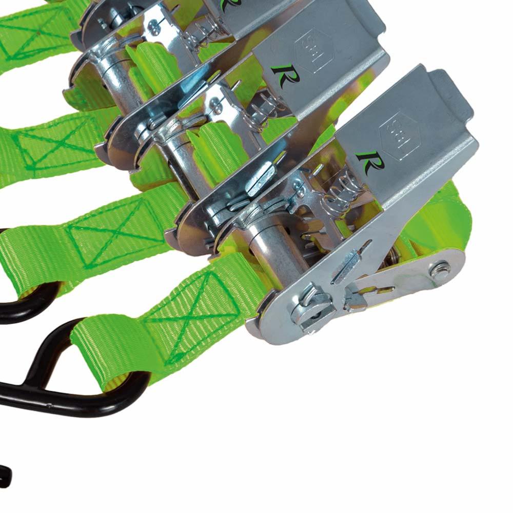 Lot de 4 sangles bagage et manutention à cliquet, tissu renforcé, résistance 500 kgs, largeur de sangle 25mm, longueur de sangle 3m, couleur verte clair pour une visibilité optimale, munies de crochets pour un maintient efficace, et un retrait sécurisé, Quantité 4 sangles