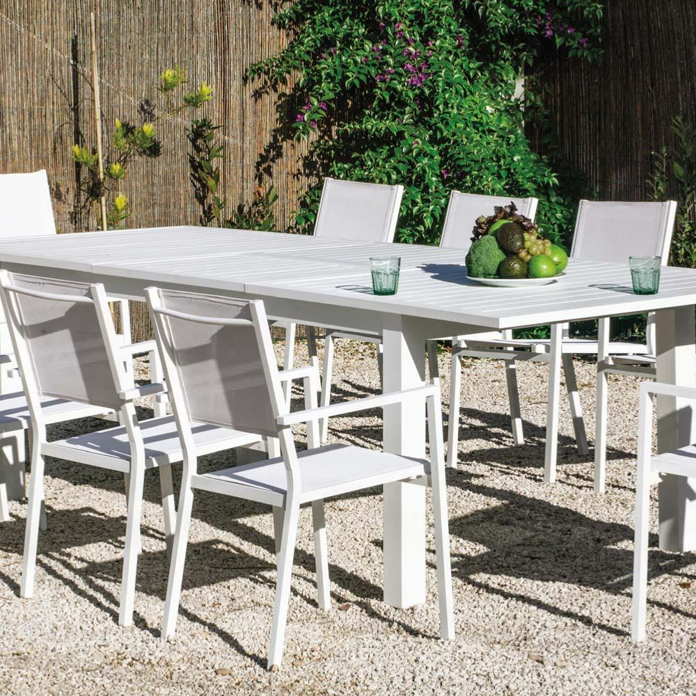 - Salon à manger extensible blanc blanc 10 places, référence fabricant 33973, modèle CAMELIA CORCEGA, idéal pour grands repas et réceptions en plein air
