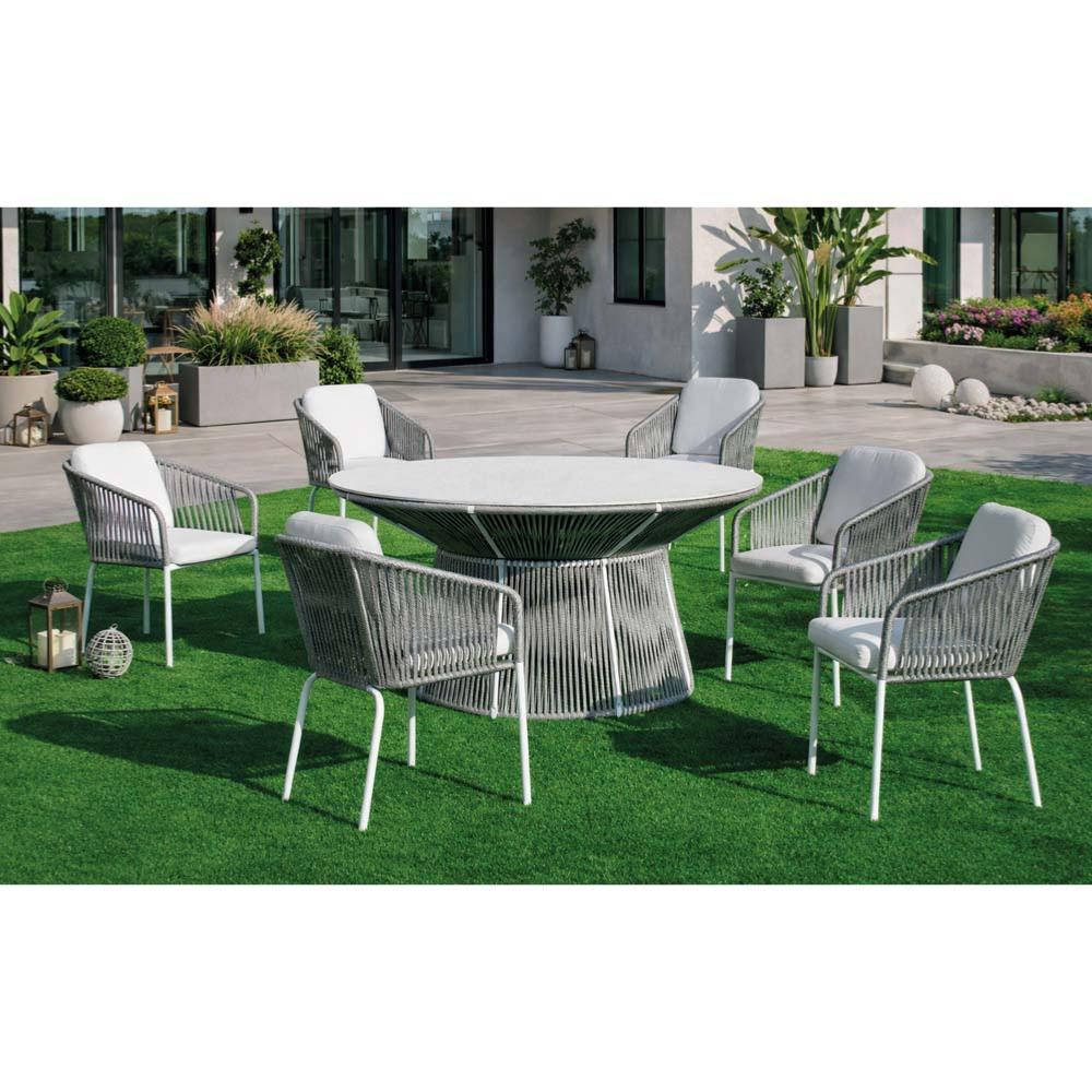 - Salon à Manger 6 places design avec table ronde RHODOS 150 cm et 6 fauteuils TULIP?3 LUX, idéal pour repas conviviaux en extérieur