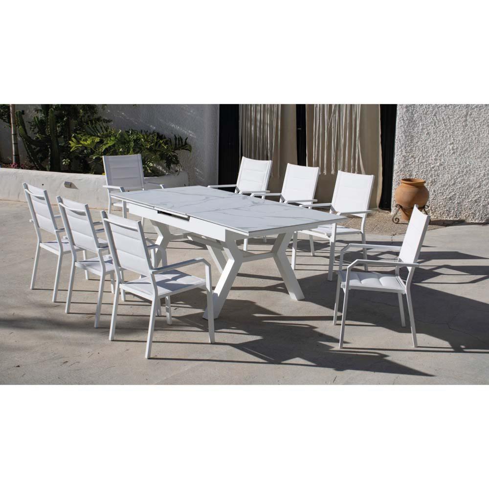 - Set complet comprenant 1 table extensible et 8 fauteuils de jardin modèle Priscilla, structure aluminium légère et robuste