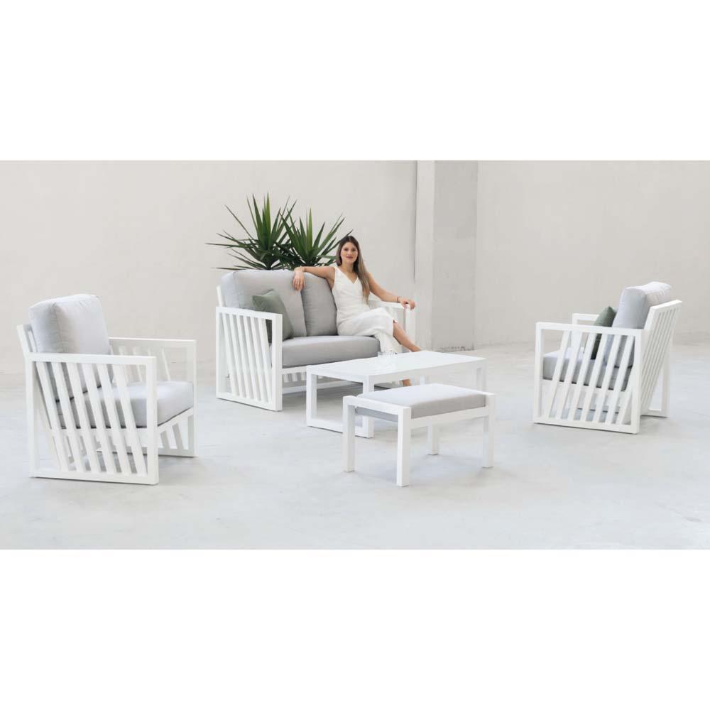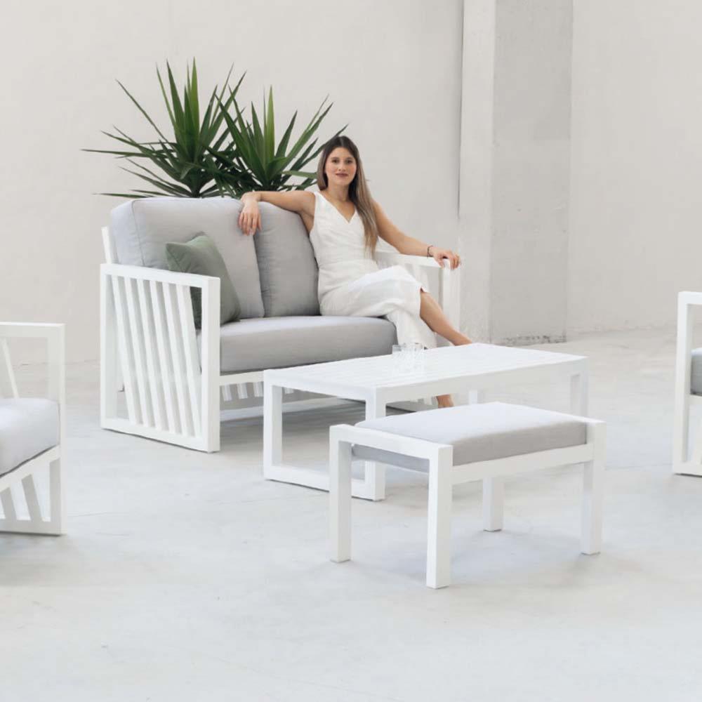 Salon jardin 4 à 5 places sofa 2 pl 2 fauteuils table basse 1 pose pied blanc gris,34002,HEVEA