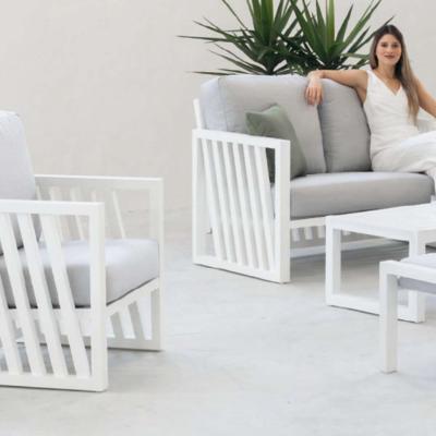 1. Salon jardin 4 à 5 places sofa 2 pl 2 fauteuils table basse repose pied blanc gris HEVIO34002 HEVEA