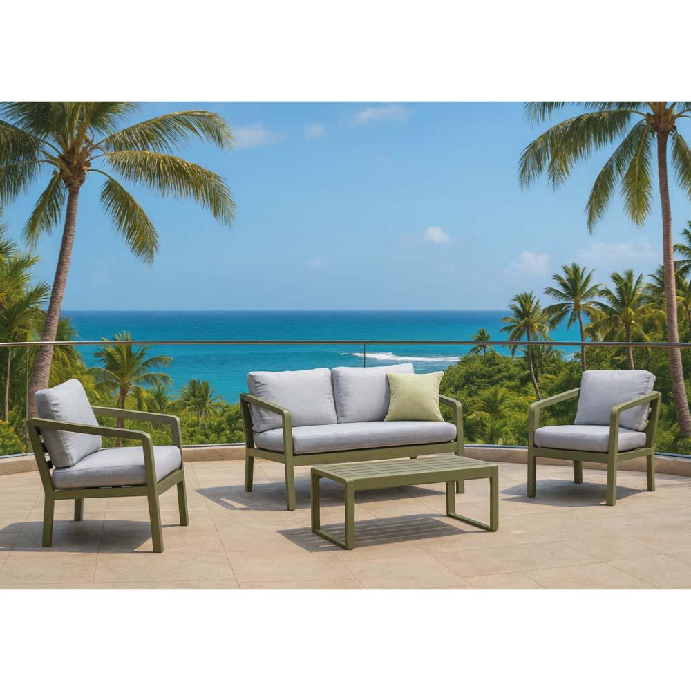 1. Salon jardin 4 à 5 places sofa 2 places 2 fauteuils table basse vert tissus gris clair HEVIO34006 HEVEA
