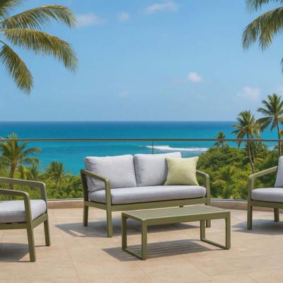 Salon jardin 4 à 5 places sofa 2 places 2 fauteuils table basse vert tissus gris clair