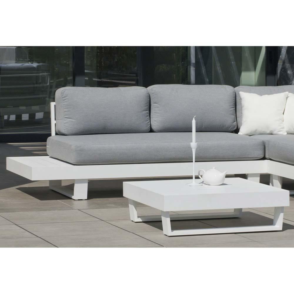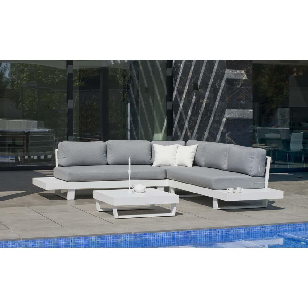 Salon jardin canapé d'angle 4 à 6 places table basse blanc tissus gris clair