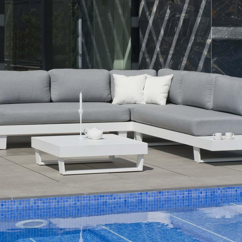 1. Salon jardin canapé d’angle 4 à 6 places table basse blanc tissus gris clair HEVIO33994 HEVEA