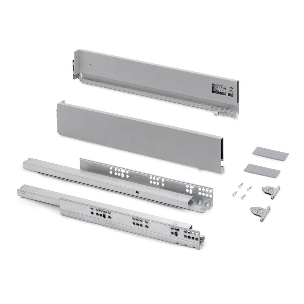 Kit pour tiroir de cuisine et salle de bain Vertex avec tous les éléments nécessaires à son montage. C'est la solution optimale pour vos meubles de cuisine, de salle de bain ou d'armoire avec un design élégant. Chaque kit est composé de tous les éléments nécessaires au montage d'un tiroir extérieur dehauteur 93mm, dimensionnées pour une épaisseur de panneau de 16mm pour le fond et l'arrière du tiroir.Comprend: deux côtés latérales, un ensemble de guides à fermeture amortie, un ensemble de couvre-garnitures et des attaches avant de tiroir.